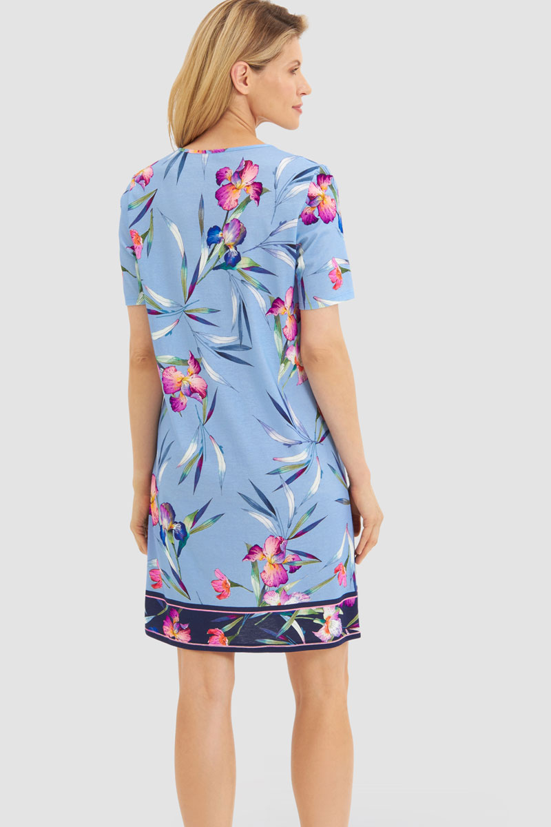 Koszula nocna krótka z krótkim rękawem. Wykonana z przyjemnej, delikatnej, bawełnianej i modalowej tkaniny drukowanej w oryginalny wzór. Sposób produkcji modalu sprawia, że stał się on dobrą alternatywą dla bawełny i jest biodegradowalny. Obydwa materiały oddychają i są niezwykle komfortowe w noszeniu. Modal pochłania jednak o 50% więcej wilgoci niż bawełna, dlatego zdecydowanie lepiej sprawdzi się jako bielizna nocna. Modal uważany jest za materiał antyalergiczny, niepodrażniający skóry, a do tego bezpieczny nawet dla najdelikatniejszych fragmentów ciała. Naukowcy twierdzą, że posiada on również właściwości, które hamują rozwój bakterii. Modal jest wyjątkowo delikatny oraz posiada gładką strukturę materiału, co jest wyjątkowo przyjemne dla skóry. Dzięki temu komfort noszenia odzieży i bielizny z modalu jest zdecydowanie większy niż w przypadku innych materiałów. Długość 90 cm. Koszula niepowtarzalna i nowoczesna.