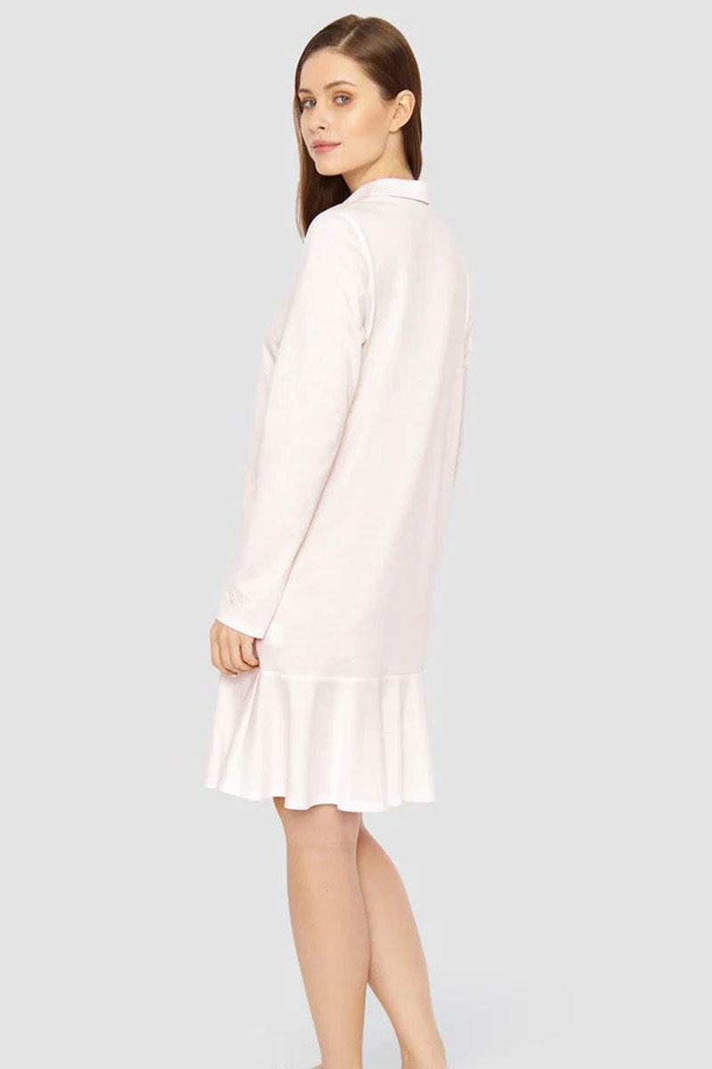 Koszula nocna damska. Długość do kolan. Zapinana na guziki. Z małym, wykładanym kołnierzem. Wykonana z przyjemnej, delikatnej, bawełnianej tkaniny. Bawełna to włókno naturalne, roślinne, cenione za swoje liczne zalety. Jest miękka, chłonna , oddychająca i wytrzymała, ma dobrą termoizolację oraz dużą higroskopijność. Stanowi też jeden z materiałów o wyższej jakości. Bawełnę cechuje przede wszystkim solidność, oraz wytrzymałość na wyższe temperatury. Nosi się ją z przyjemnością, gdyż jest miękka, gładka i przyjemna w dotyku i nie podrażnia skóry. Koszula kobieca i subtelna. Długość 90 cm.