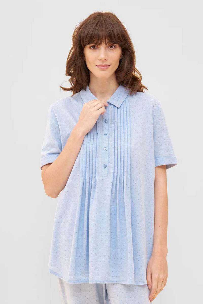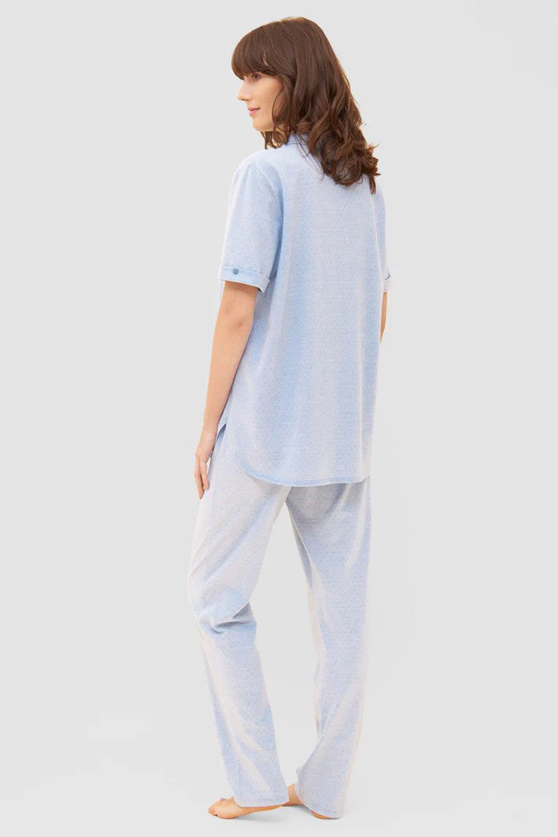 Piżama damska. Bluzka z krótkim rękawem. Spodnie długie, klasyczne. Wykonana z przyjemnej, bawełnianej tkaniny. Bawełna to włókno naturalne, roślinne, cenione za swoje liczne zalety. Jest miękka, chłonna , oddychająca i wytrzymała, ma dobrą termoizolację oraz dużą higroskopijność. Stanowi też jeden z materiałów o wyższej jakości. Bawełnę cechuje przede wszystkim solidność, oraz wytrzymałość na wyższe temperatury. Nosi się ją z przyjemnością, gdyż jest miękka, gładka i przyjemna w dotyku i nie podrażnia skóry. Piżama elegancka i klasyczna.