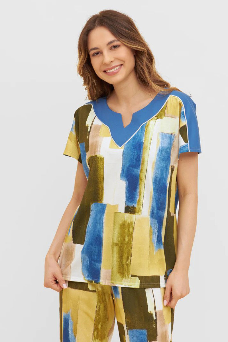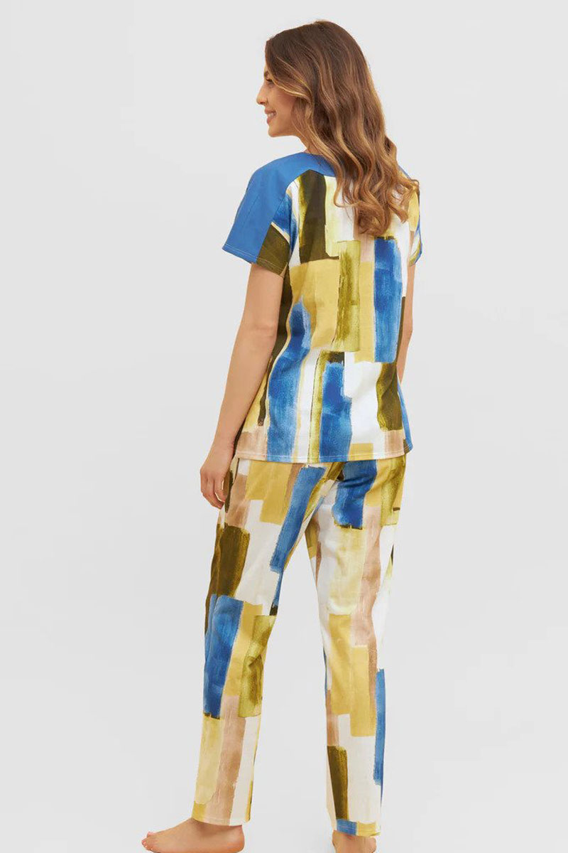 Piżama damska. Bluzka z krótkim rękawem. Spodnie długie, klasyczne. Wykonana z przyjemnej, bawełnianej tkaniny. Bawełna to włókno naturalne, roślinne, cenione za swoje liczne zalety. Jest miękka, chłonna , oddychająca i wytrzymała, ma dobrą termoizolację oraz dużą higroskopijność. Stanowi też jeden z materiałów o wyższej jakości. Bawełnę cechuje przede wszystkim solidność, oraz wytrzymałość na wyższe temperatury. Nosi się ją z przyjemnością, gdyż jest miękka, gładka i przyjemna w dotyku i nie podrażnia skóry.
