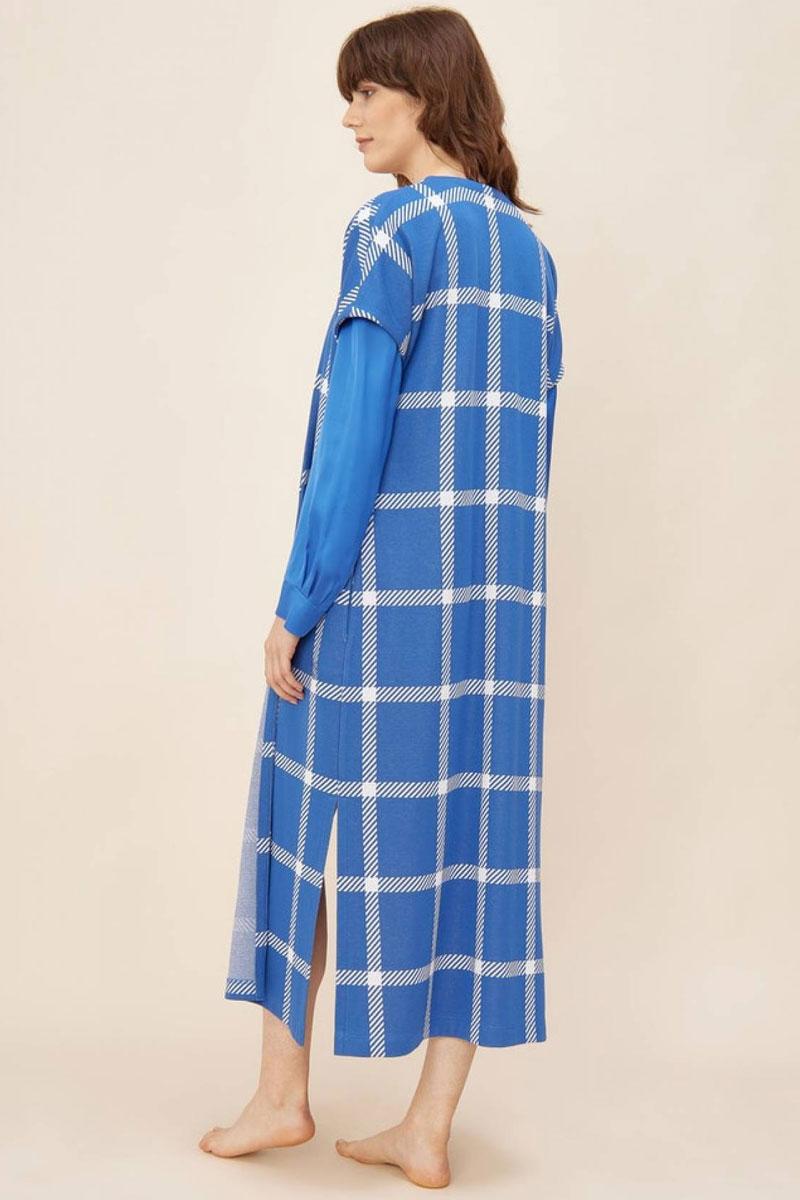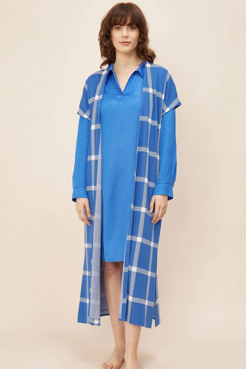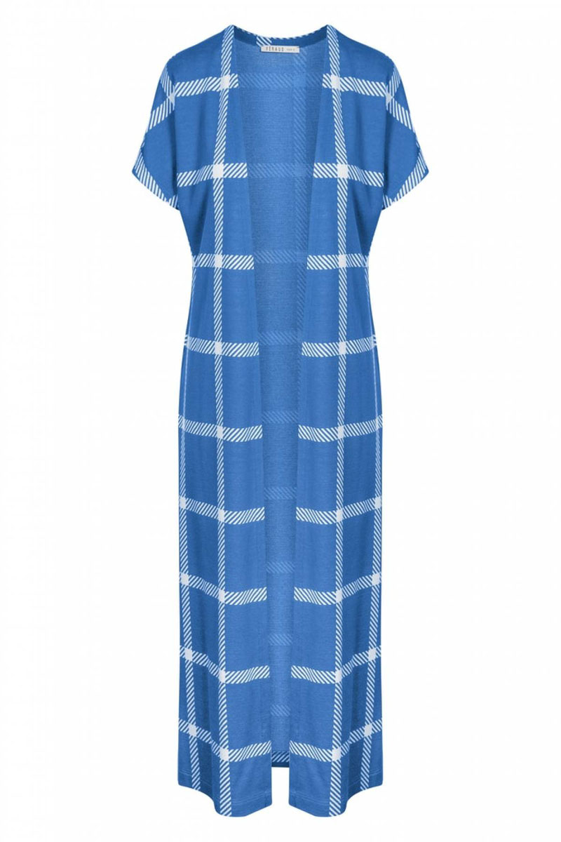 Podomka – kamizelka damska, długa z krótkim rękawem. Wykonany z przyjemnej, bawełnianej i wiskozowej tkaniny drukowanej w ponadczasowy wzór kraty. Po bokach wszyte kieszenie. Długość 120 cm. Podomka nowoczesna i praktyczna.