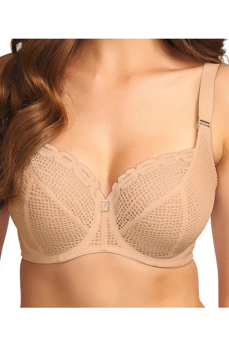 Biustonosz z miękkimi miseczkami, z fiszbinami o kroju typu underwired, balcony bra. Dzięki krojonej na trzy części miseczce i patce ją przedłużającej zapewnia doskonałe podtrzymanie biustu. Cały wykonany z materiału imitującego siateczkę . Element ozdobny-mała koronkowa lamówka u brzegu miseczek. Dostępny do miseczki K.