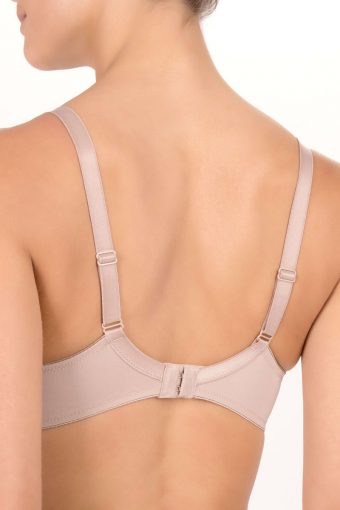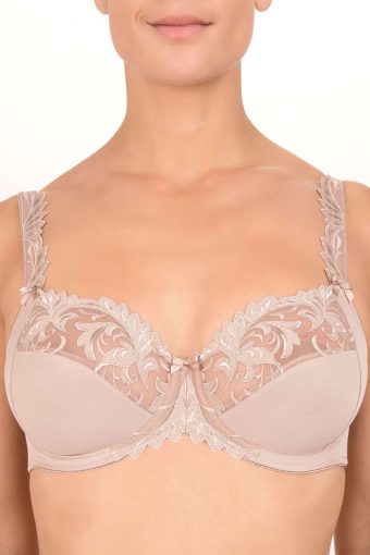 Biustonosz z miękkimi miseczkami z fiszbinami o kroju typu underwired full cup bra. Miseczki posiadają boczne patki, które świetnie zbierają biust do środka. Wykonany z wysokiej jakości, gładkiej, jednolitej tkaniny. Miseczki i ramiączka wykończone piękną, bogatą koronką. Ramiączka z tyłu regulowane. Występuje do miseczki H.