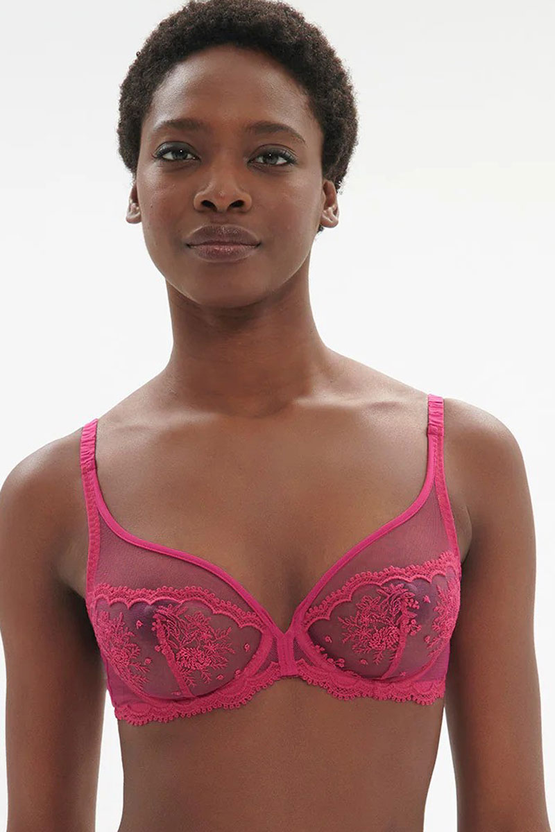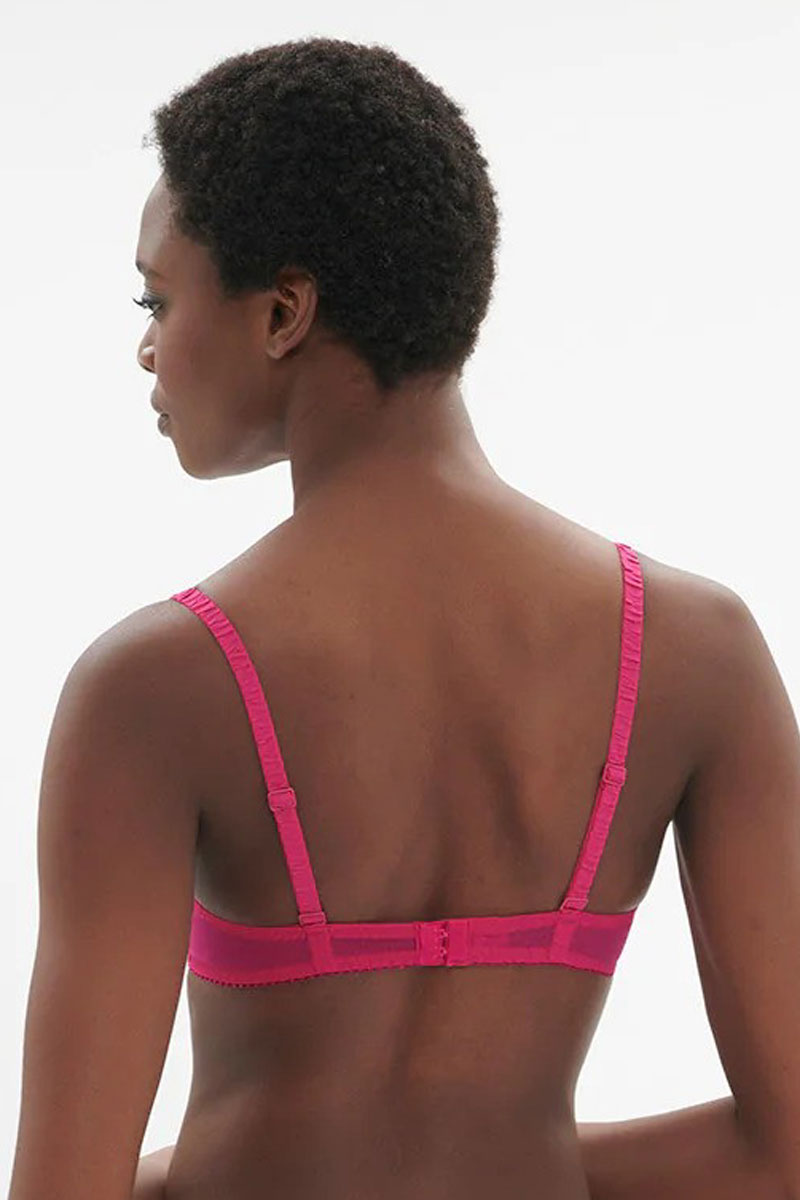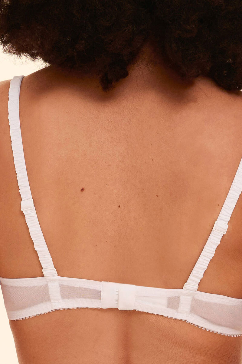 Biustonosz z miękkimi miseczkami z fiszbinami o kroju typu underwired, triangle, plunge bra. Miseczki posiadają pionowe cięcia. Biustonosz doskonale zbiera biust do środka eksponując dekolt. Wykonany z tiulu haftowanego w delikatne, kwiatowe i florystyczne wzory . Biustonosz posiada dość niski karczek. Ramiączka proste, komfortowe z tyłu regulowane. Występuje do miseczki F.
