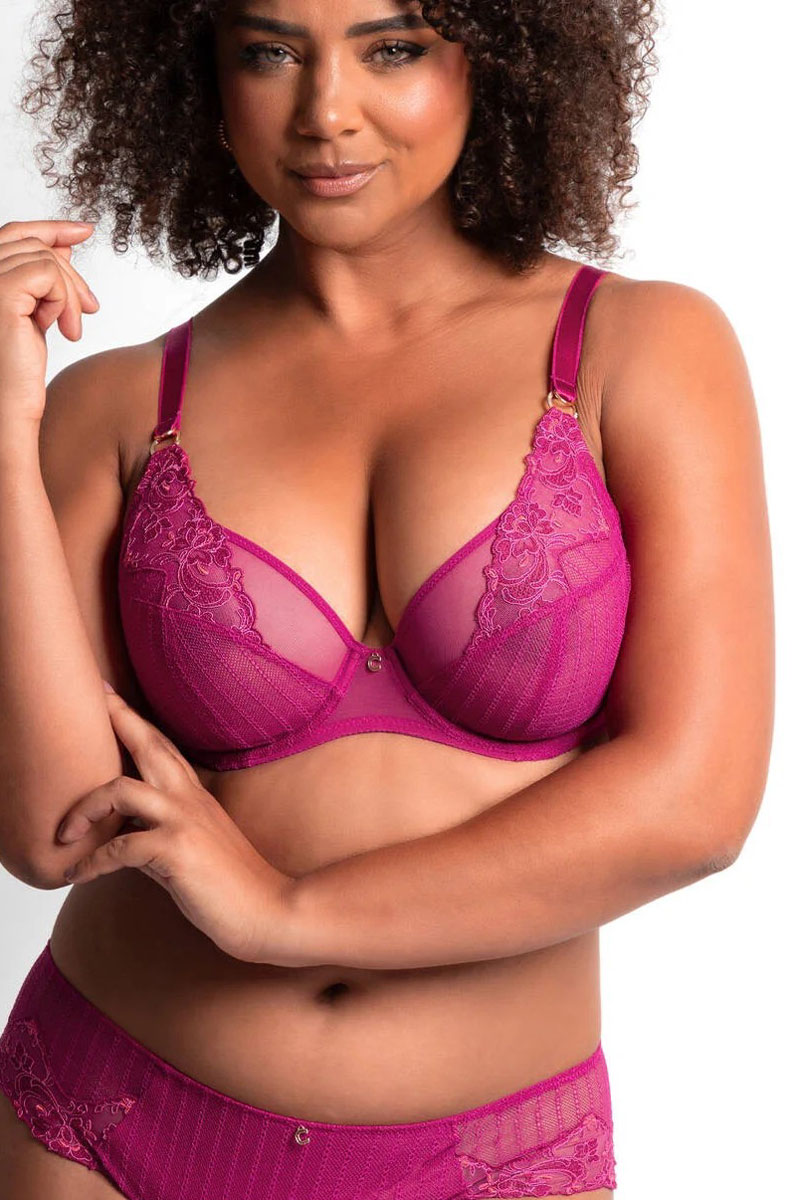 Biustonosz z miękkimi miseczkami z fiszbinami o kroju typu underwired, plunge bra. Biustonosz posiada niski karczek. Miseczki posiadają pionowe cięcia. Biustonosz zbiera biust do środka. Biustonosz wykonany z tiulu haftowanego w oryginalne wzory. Ramiączka ozdobne, komfortowe z tyłu regulowane. Występuje do miseczki F.