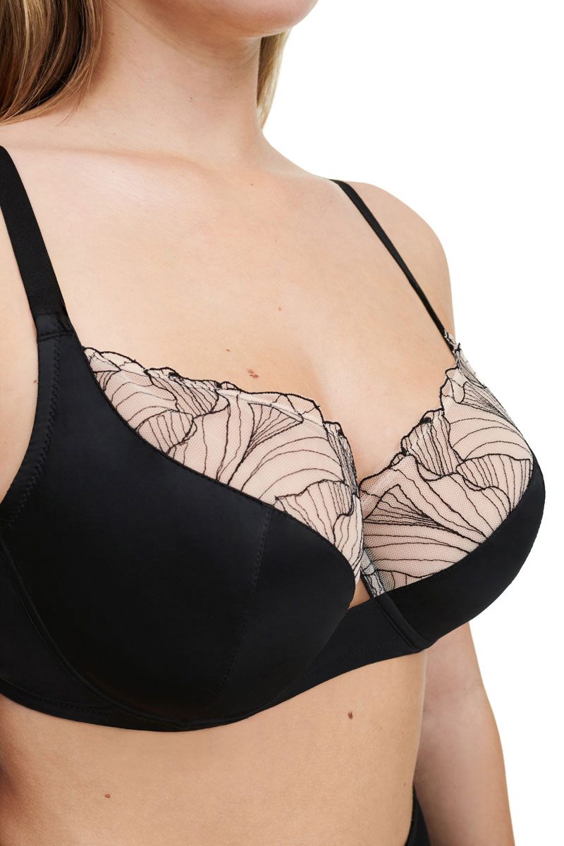 Biustonosz z miękkimi miseczkami z fiszbinami o kroju klasycznym, mocno zabudowanym typu very covering underwired bra. Biustonosz posiada dość wysoki karczek. Miseczki krojone są na dwie części oraz posiadają boczne patki, które zbierają biust do środka. Biustonosz unosi i podtrzymuje nawet większy biust. Biustonosz wykonany jest z oryginalnej koronki. Ramiączka szersze, komfortowe z tyłu regulowane. Biustonosz występuje do miseczki H.