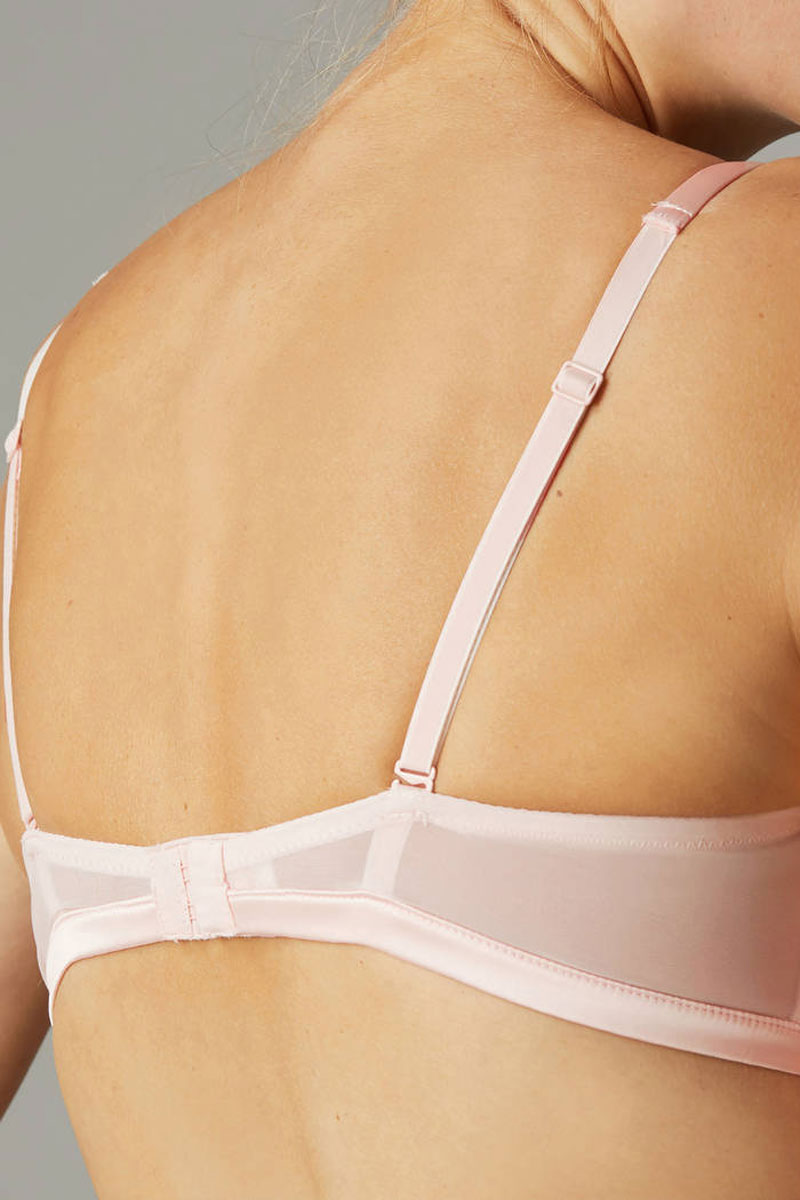 Biustonosz z miękkimi miseczkami z fiszbinami o kroju typu underwired , balcony bra. Miseczki posiadają pionowe cięcia dzięki czemu unoszą biust do góry eksponując dekolt. Biustonosz wykonany jest z tiulu haftowanego w piękny, kwiatowy wzór. Góra miseczek wykończona jest ozdobną lamówką. Między miseczkami element biżuteryjny. Ramiączka cienkie, delikatne z tyłu regulowane. Biustonosz jest wyjątkowo delikatny i kobiecy. Występuje do miseczki E.