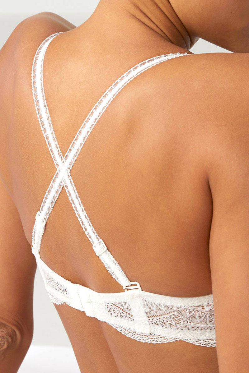 Biustonosz z miękkimi miseczkami z fiszbinami o kroju typu balcony bra. Miseczki posiadają pionowe cięcia. Biustonosz posiada niski karczek. Wykonany z pięknej, delikatnej, kwiatowej, francuskiej koronki. Ramiączka cieniutkie, delikatne, podwójne z tyłu regulowane – można je z tyłu odpiąć i przepiąć na plecach na krzyż .Występuje do miseczki E.