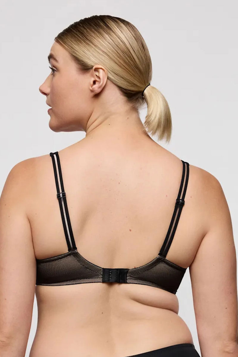 Biustonosz z lekko usztywnionymi miseczkami z fiszbinami o kroju typu half padded plunge bra. Miseczki od dołu usztywnione za pomocą wyprofilowanej gąbki. Miseczki zbierają biust do środka. Ramiączka komfortowe, ozdobne z tyłu regulowane. Miseczki świetnie modelują nawet większy biust. Biustonosz występuje do miseczki G.