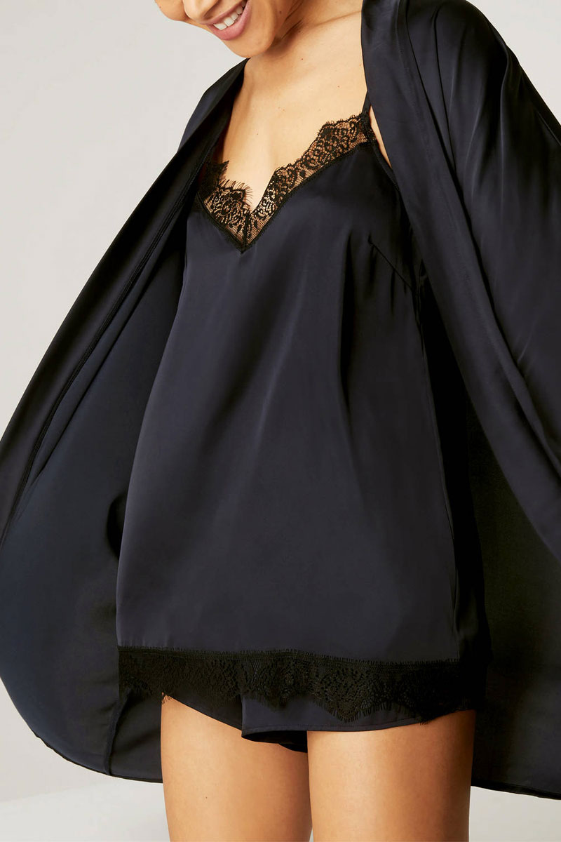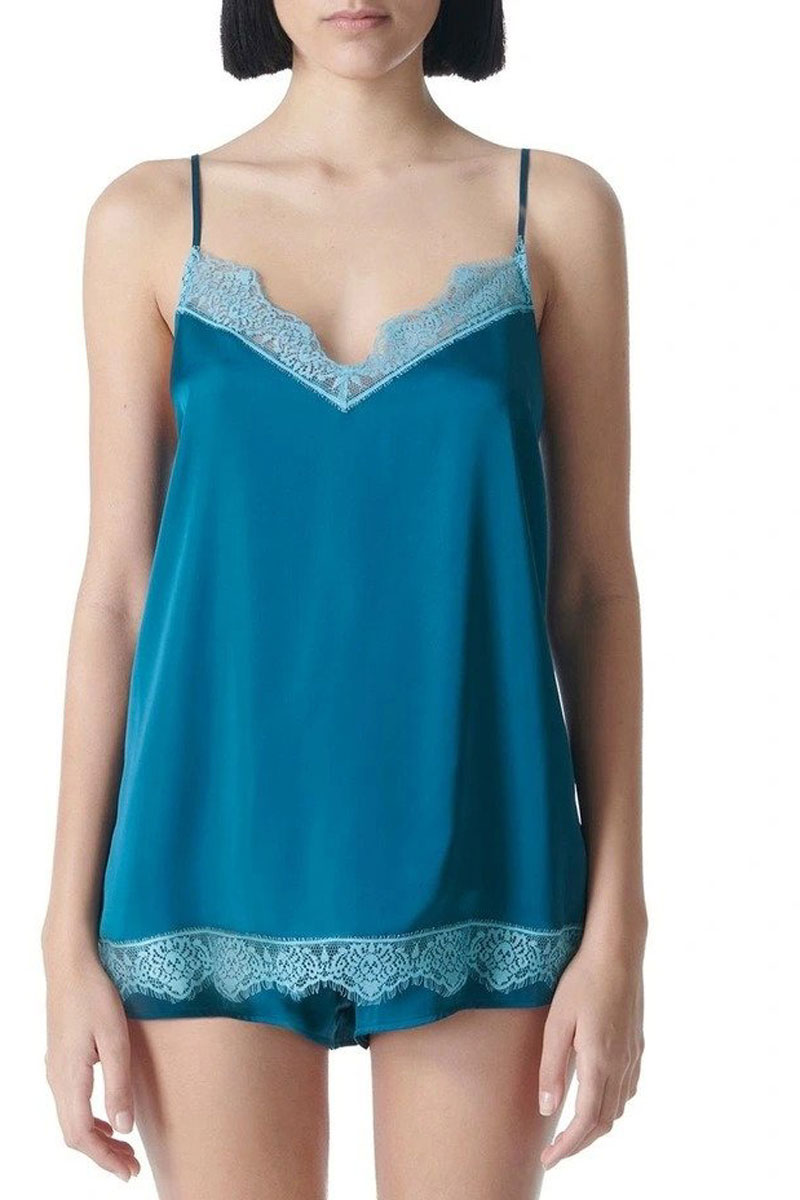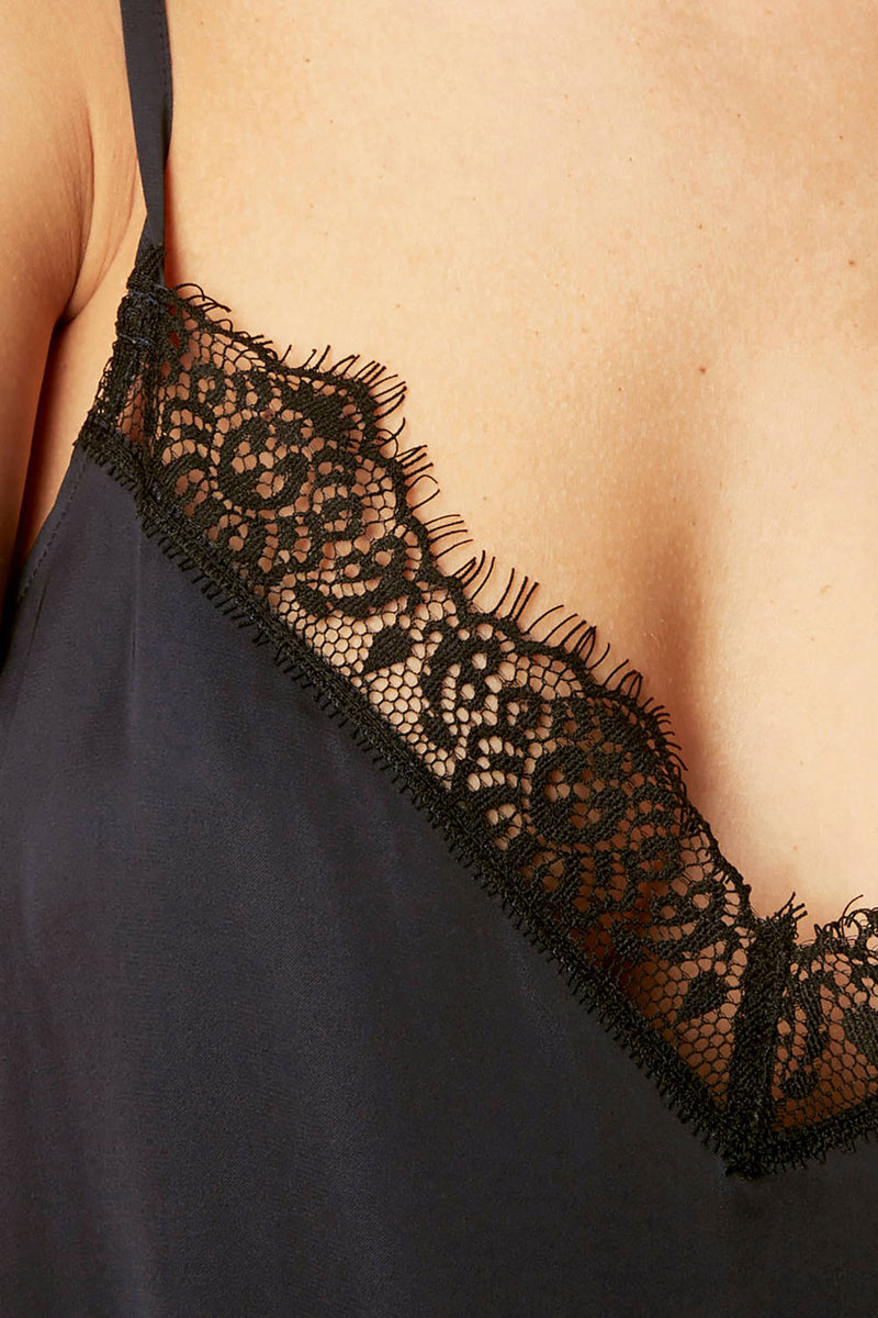 Koszulka-top na cienkich, regulowanych z tyłu ramiączkach.Dekolt w kształcie litery V. Góra i dół koszulki wykończone piękną, francuską, ekskluzywną koronką.Koszulka bardzo kobieca i elegancka.Wykonana z cienkiej, przyjemnej, delikatnej tkaniny.