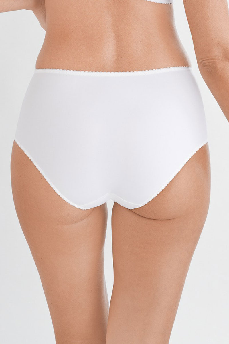 Majtki klasyczne typu tai- maxi brief. Wysokie do talii, mocno zabudowane na biodrach. Tył gładki. Przód wykonany z materiału drukowanego w delikatny wzór. Boki wykonane z haftowanego tiulu.