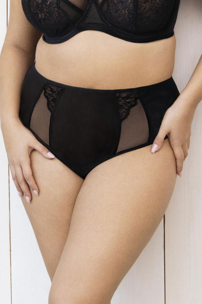 Majtki klasyczne typu tai-maxi brief. Wysokie do talii, mocno zabudowane na biodrach. Wykonane z gładkiej, jednolitej tkaniny. Przód ozdobiony lekko przeźroczystą, koronkową wstawką i dodatkowo wzmocniony. Lekko modeluje i wyszczupla sylwetkę.