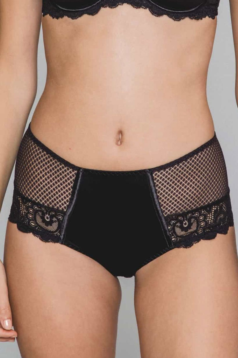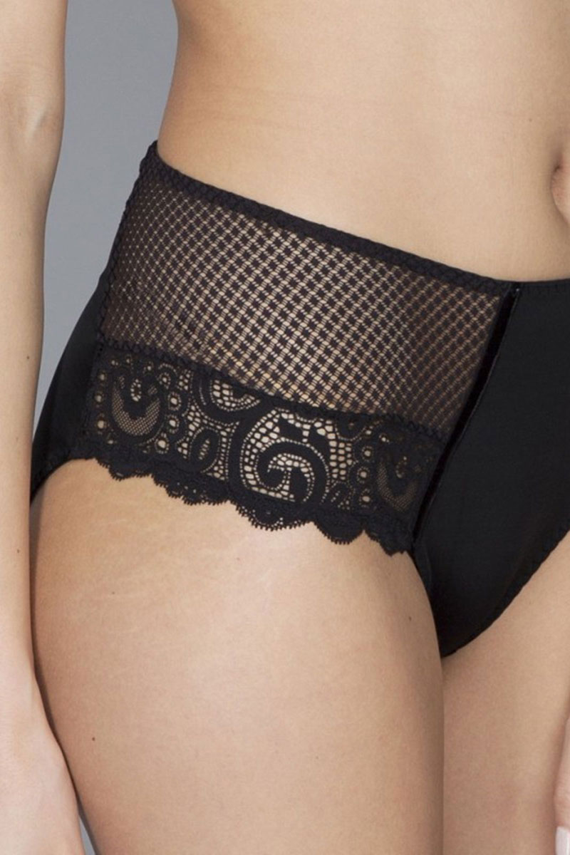 Majtki klasyczne typu tai- maxi-retro. Wysokie do talii, mocno zabudowane na biodrach. Przód i tył wykonane z gładkiej, jednolitej tkaniny. Boki wykończone francuską koronką.
