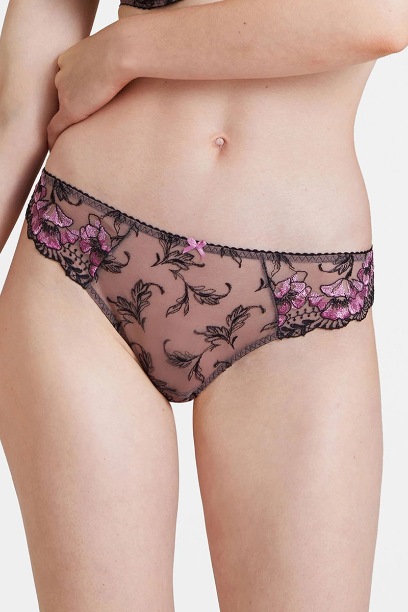 Majtki klasyczne typu tai- italian brief. Mocniej wykrojone na biodrach. Przód i tył wykonane z tiulu haftowanego w piękny, oryginalny, niepowtarzalny wzór.