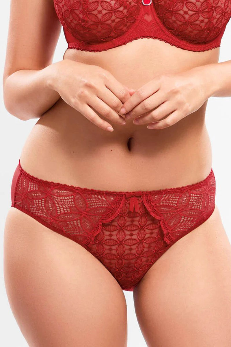 Majtki klasyczne typu tai. Mocniej wykrojone na biodrach. Tył majteczek wykonany z gładkiego, jednolitego materiału. Przód wykonany z haftowanego tiulu. Majtki ozdobione gipiurowymi wstawkami.