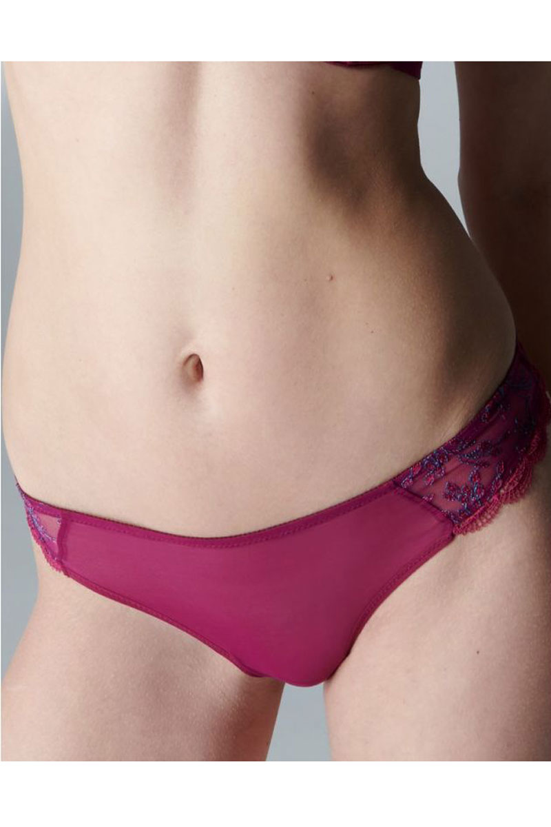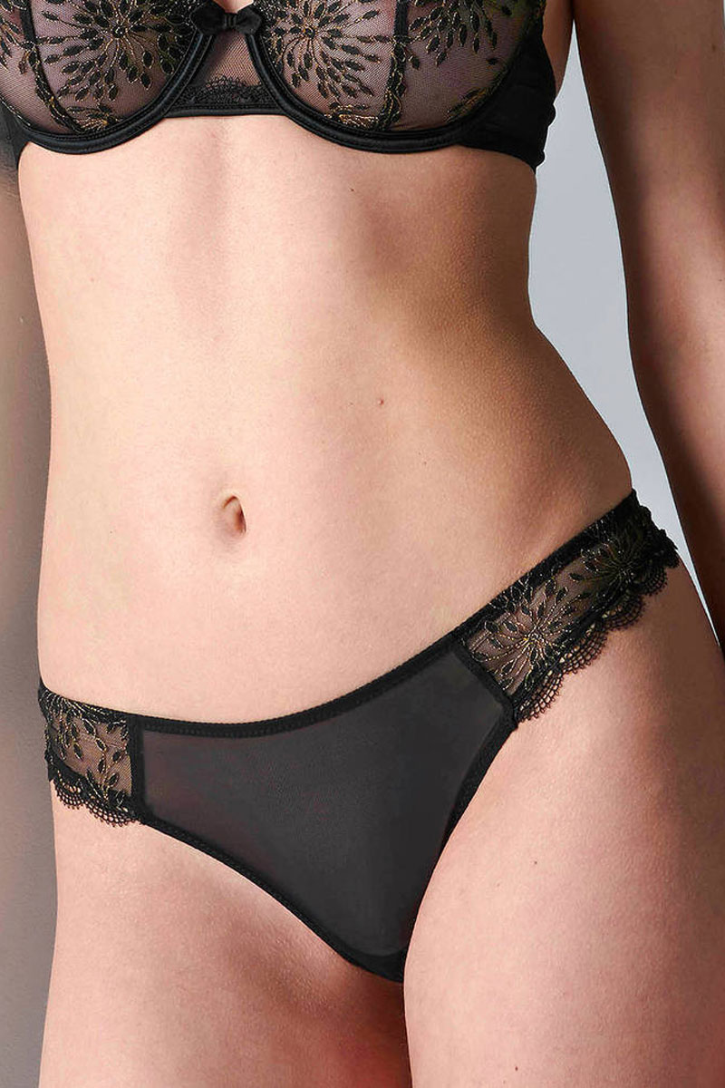 Majtki typu string-tanga o szerszych bokach.Wykonane z gładkiego, jednolitego materiału oraz tiulu haftowanego w oryginalny hiszpański haft z motywem kwiatowym.