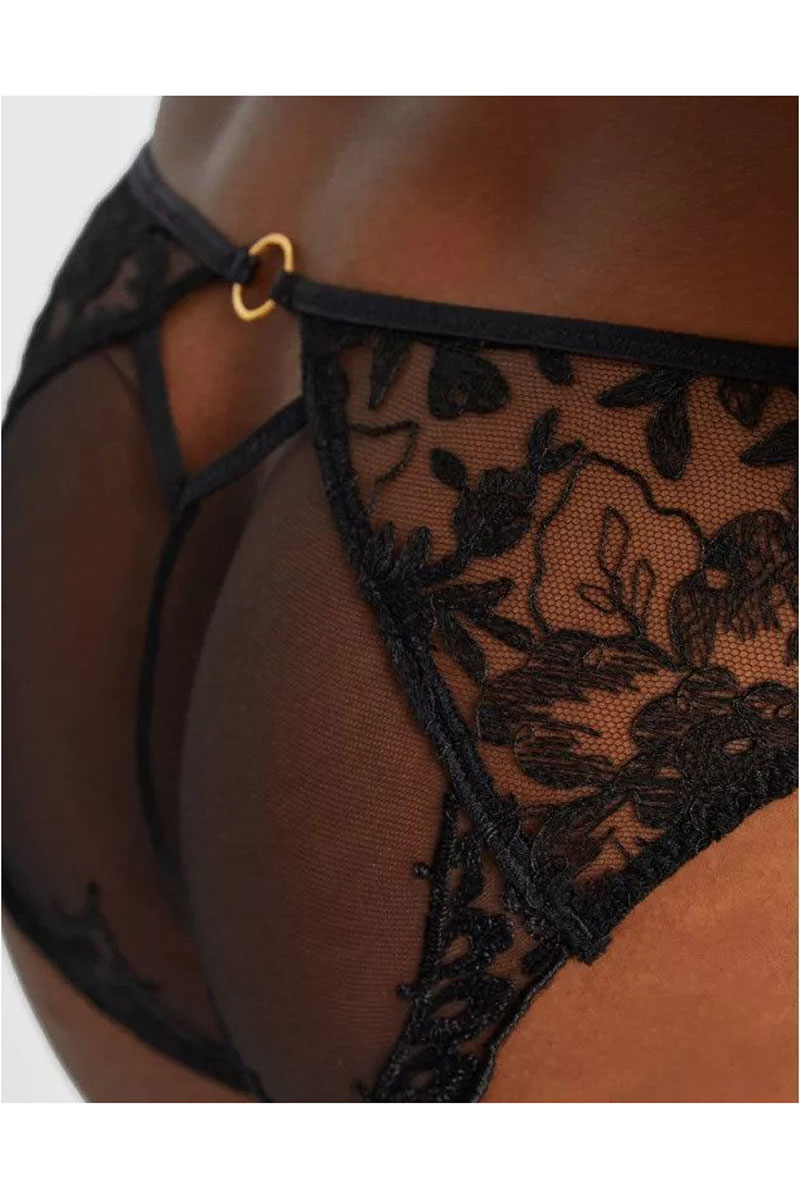Majtki klasyczne typu tai-mini coeur. Mocniej wykrojone na biodrach. Przód i tył wykonane z tiulu haftowanego w oryginalny, florystyczny wzór.