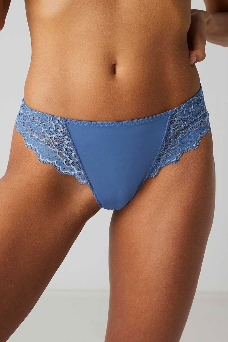 Majtki typu stringi – tanga o szerszych bokach. Wykonane z gładkiego, jednolitego materiału oraz pięknej, francuskiej koronki.