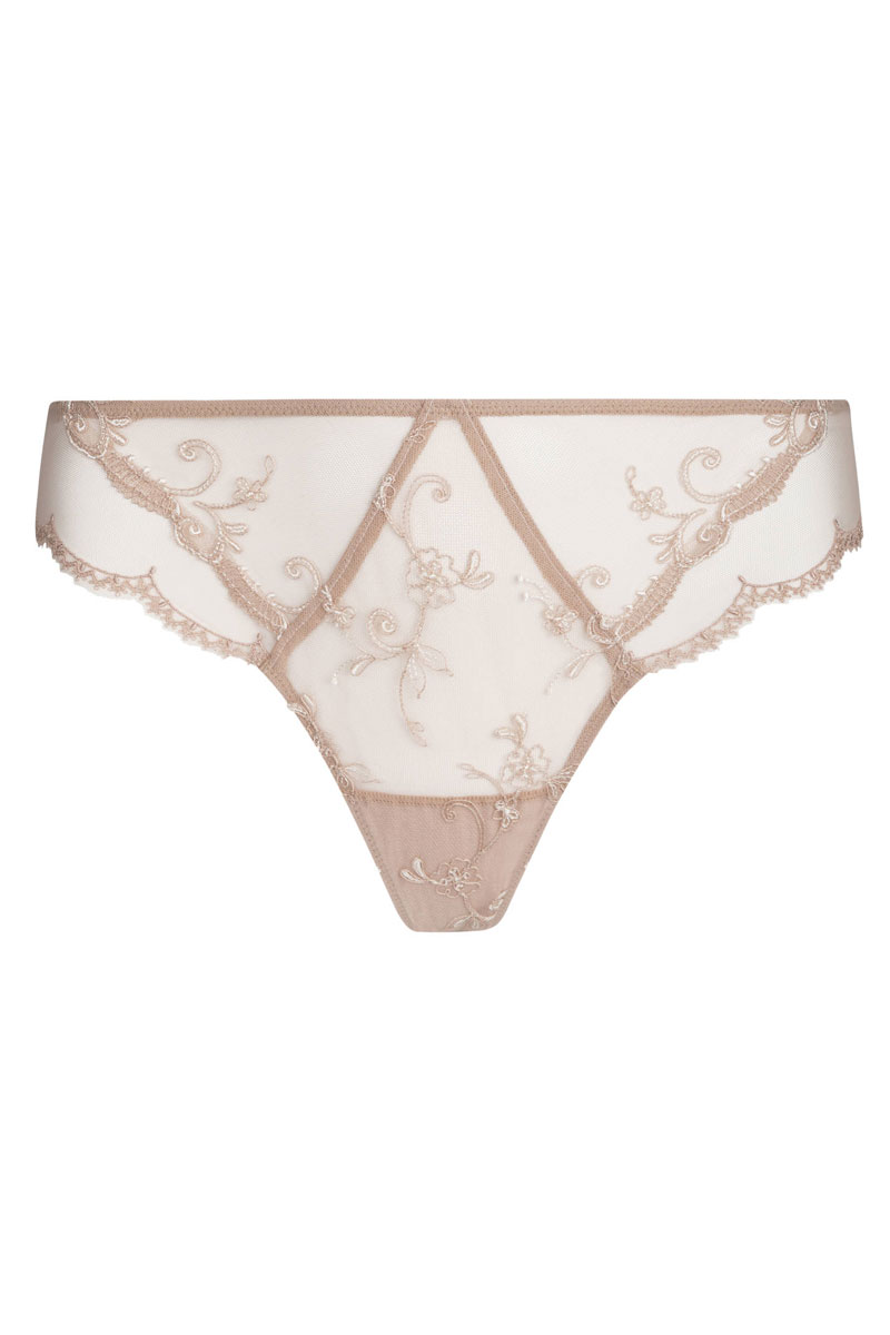 Majtki typu stringi – tanga o szerszych bokach. Wykonane z tiulu haftowanego w oryginalne, florystyczne wzory oraz z francuskiej koronki z Calais. Ozdobione są gipiurowymi elementami.