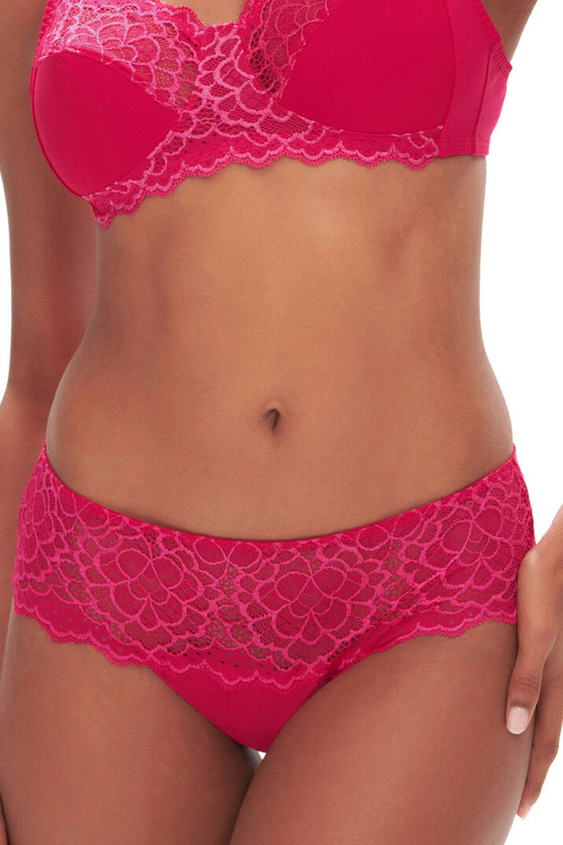 Majtki typu szorty – hipster o szerszych bokach. Wykonane z gładkiego, jednolitego materiału oraz pięknej, delikatnej, francuskiej koronki.
