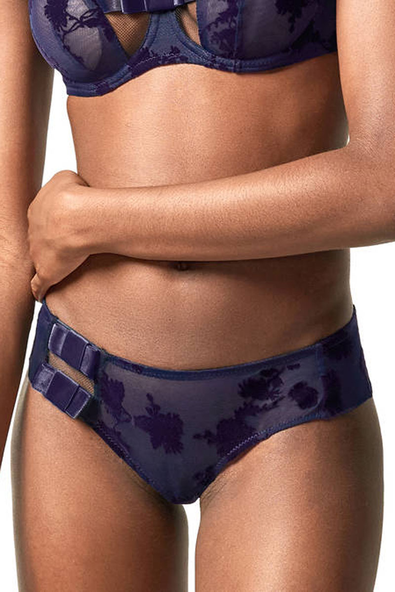 Majtki typu szorty-stringi o szerszych bokach.Wykonane z tiulu haftowanego w oryginalny, kwiatowy wzór i wykończone są tiulowymi wstawkami.
