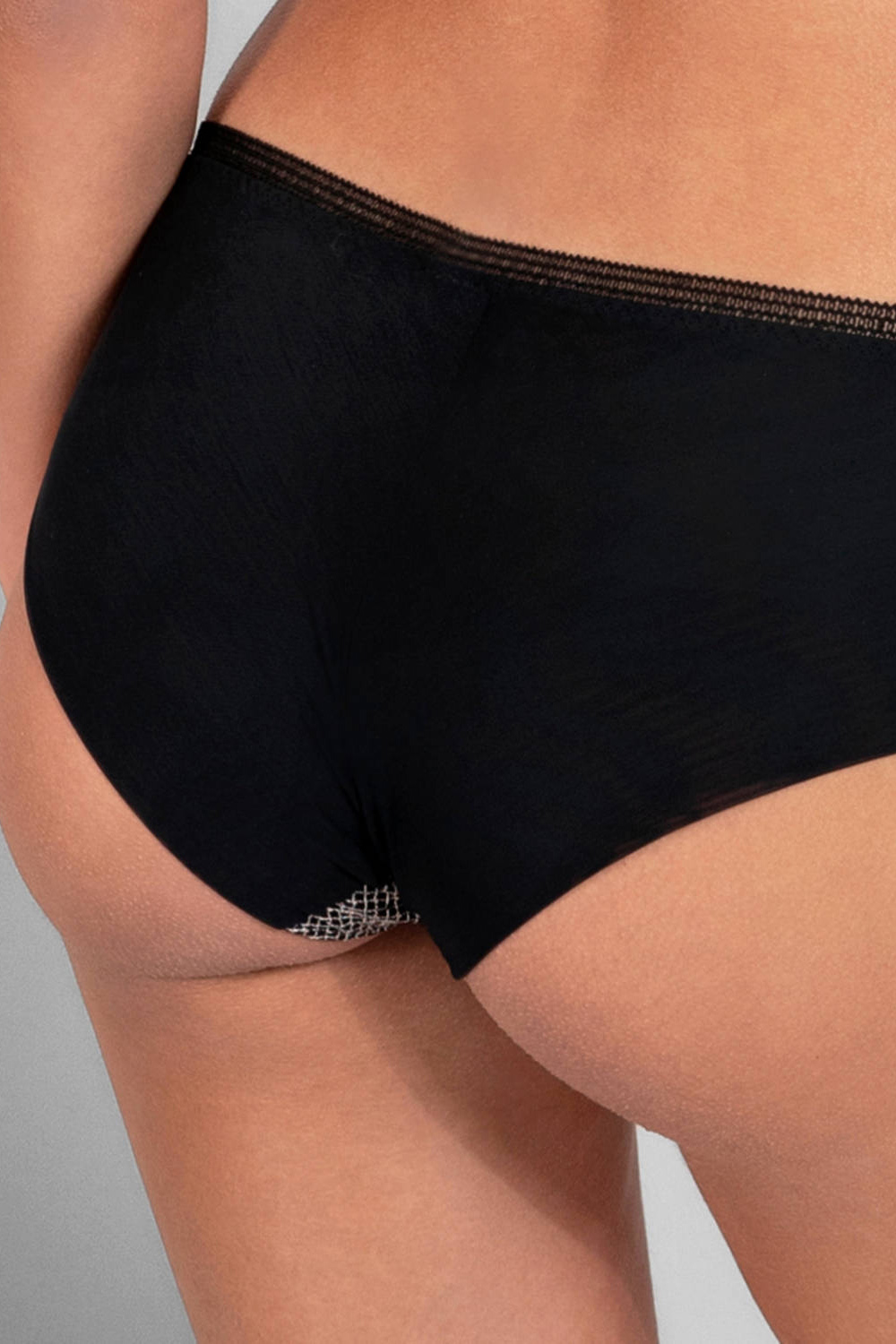 Majtki typu szorty o szerszych bokach. Tył gładki. Przód wykonany z haftowanego tiulu. Majtki ozdobione koronką i gipiurowymi wstawkami.