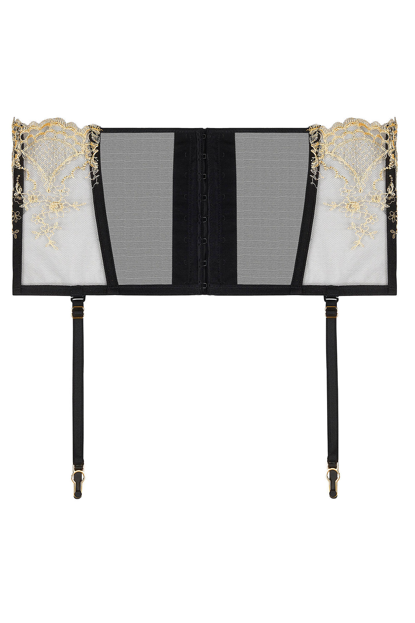 Pas do pończoch – szeroki typu waist cincher. Zapinany z tyłu na haftki. Istnieje możliwość całkowitego odpięcia pasków do pończoch. Wykonane z najwyższej jakości delikatnej tkaniny. Wykończony kunsztownymi, haftowanymi złotem elementami. Pas bardzo efektowny. Kolekcja ta marki Lise Charmel jest subtelnie haftowana złotem , a każdy jej element ucieleśnia wyrafinowanie, zmysłowość i elegancję.