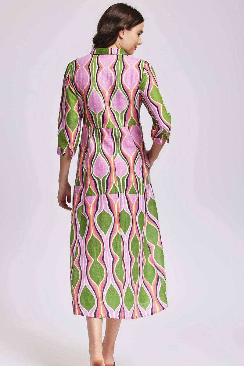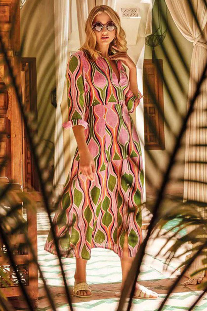 Sukienka letnia długa. Zapinana na guziki. Z małym, wykładanym kołnierzem. Z rękawami o długości 3/4, które zakończone są mankietami. Sukienka wykonana z przyjemnej, przewiewnej tkaniny z bawełny drukowanej w wielokolorowy, niepowtarzalny wzór. Bawełna to włókno naturalne, roślinne, cenione za swoje liczne zalety. Jest miękka, chłonna , oddychająca i wytrzymała, ma dobrą termoizolację oraz dużą higroskopijność. Stanowi też jeden z materiałów o wyższej jakości. Bawełnę cechuje przede wszystkim solidność, oraz wytrzymałość na wyższe temperatury. Nosi się ją z przyjemnością, gdyż jest miękka, gładka i przyjemna w dotyku i nie podrażnia skóry. Przód sukienki ozdobiony subtelnymi elementami ozdobnymi . Długość 125 cm. Sukienka bardzo oryginalna.