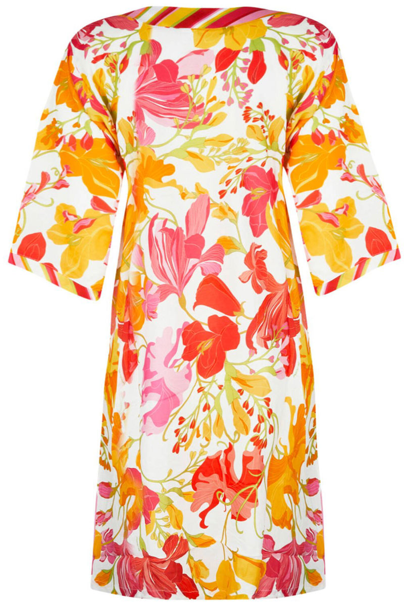 Tunika plażowa, letnia krótka. Z rękawem o długości do łokcia. Dekolt w kształcie litery V. Wykonana z przewiewnej, delikatnej, naturalnej tkaniny z wiskozy –  drukowanej w niepowtarzalny wzór. Wiskoza jest przewiewna i lekka, produkowana jest z włókien celulozy, co sprawia iż gwarantuje ona dobre właściwości higroskopijne, świetnie pochłania pot i wodę i odprowadza je z powierzchni skóry. Włókna wiskozowe są bardzo miękkie i przyjemne w dotyku. Wiskoza jest bez wątpienia idealnym materiałem na letnią odzież. Długość 90 cm. Tunika efektowna i oryginalna.