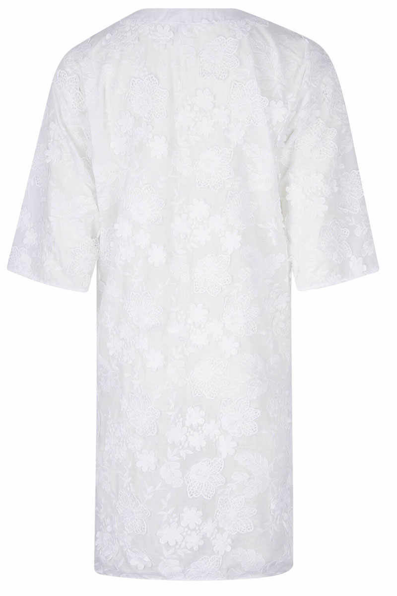 Tunika plażowa – letnia krótka – cotton, beach cover up. Dekolt w kształcie litery V. Rękaw o długości 3/4. Wykonana z cienkiego, delikatnego, przewiewnego materiału z bawełny. Tunika wykończona satynowym haftem i gipiurowymi, kwiatowymi wstawkami. Długość 95 cm. Tunika elegancka i subtelna.
