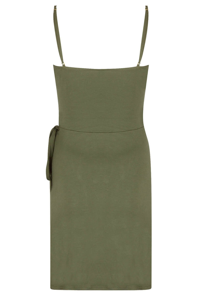 Sukienka plażowa krótka w stylu kopertowym – zakładana. Zawiązywana z boku za pomocą paska. Dekolt w kształcie litery V – optycznie wysmukla sylwetkę. Na cienkich regulowanych z tyłu ramiaczkach. Wykonana z delikatnej, przewiewnej, cienkiej, wisozowej tkaniny. Wiskoza jest przewiewna i lekka, produkowana jest z włókien celulozy, co sprawia iż gwarantuje ona dobre właściwości higroskopijne, świetnie pochłania pot i wodę i odprowadza je z powierzchni skóry. Chłodzi latem, doskonale pochłania wilgoć (nawet lepiej niż bawełna), jest delikatna dla skóry, często stosowana w produktach dla alergików. Włókna wiskozowe są bardzo miękkie i przyjemne w dotyku. Wiskoza jest bez wątpienia idealnym materiałem na letnią odzież. Długość 95cm.