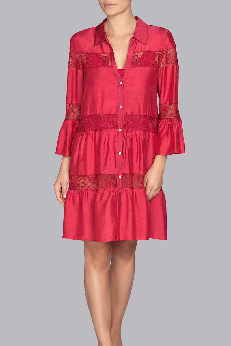 Tunika plażowa. Długość do kolan. Z małym kołnierzykiem. Zapinana na guziki. Dekolt w kształcie litery V. Rękawy i dół tuniki wykończone delikatną falbaną. Długość 95cm. Tunika wykonana z przyjemnej, delikatnej, przewiewnej, wiskozowej tkaniny.Wiskoza jest przewiewna i lekka, produkowana jest z włókien celulozy, co sprawia iż gwarantuje ona dobre właściwości higroskopijne, świetnie pochłania pot i wodę i odprowadza je z powierzchni skóry. Włókna wiskozowe są bardzo miękkie i przyjemne w dotyku. Wiskoza jest bez wątpienia idealnym materiałem na letnie sukienki. Elegancka i efektowna.