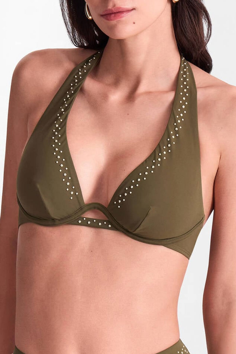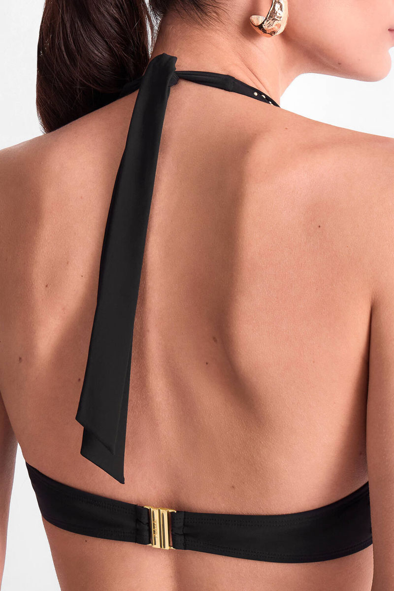 Biustonosz z miękkimi miseczkami z fiszbinami o kroju typu underwired, triangle, plunge bikini bra. Miseczki posiadają pionowe cięcia. Biustonosz posiada niski karczek. Miseczki zbierają biust do środka eksponując dekolt. Ramiączka proste – zawiązywane na szyję. Biustonosz doskonale podtrzymuje nawet większy biust. Ozdobiony biżuteryjnymi elementami. Występuje do miseczki E.