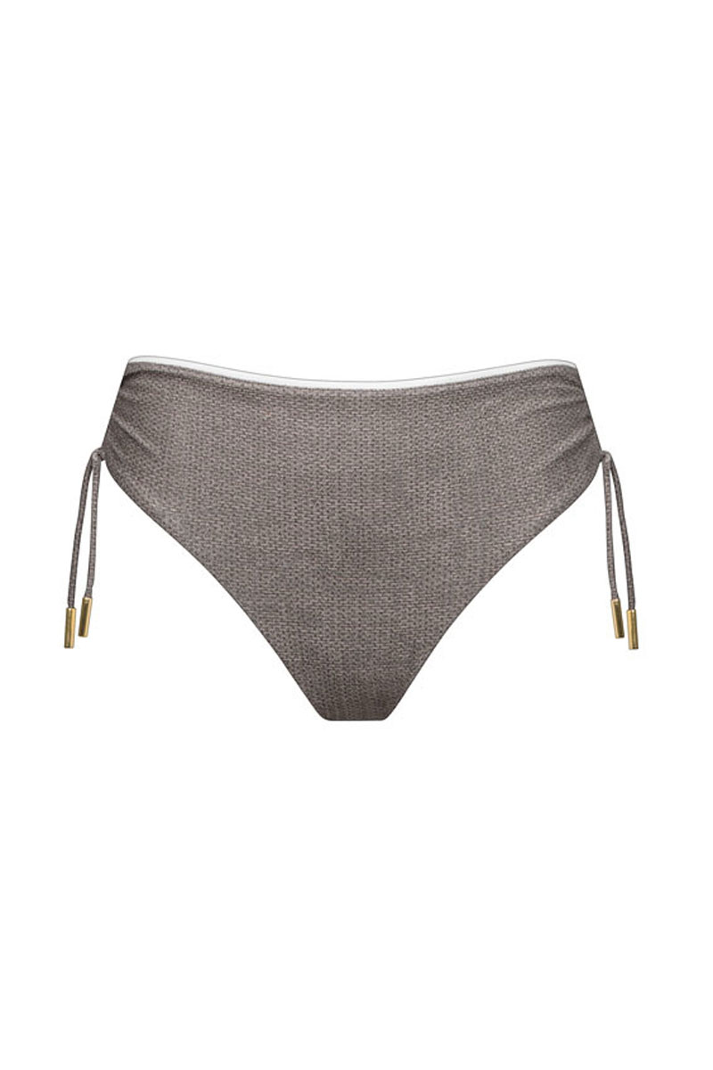 Strój kąpielowy dwuczęściowy. Biustonosz z usztywnianymi miseczkami bez fiszbin o kroju typu triangle bra. Miseczki usztywnione za pomocą wyprofilowanej gąbki. Ramiączka regulowane – można je z tyłu odpiąć i zawiązać na szyję . Majtki klasyczne typu tai – wysokie do talii – istnieje możliwość regulacji boków za pomocą troczków. Strój wykonany z najwyższej jakości tkaniny z lycrą – tkanina jest delikatnie nabłyszczana – srebrzy się i subtelnie opalizuje . Strój bardzo ciekawy, efektowny i oryginalny.