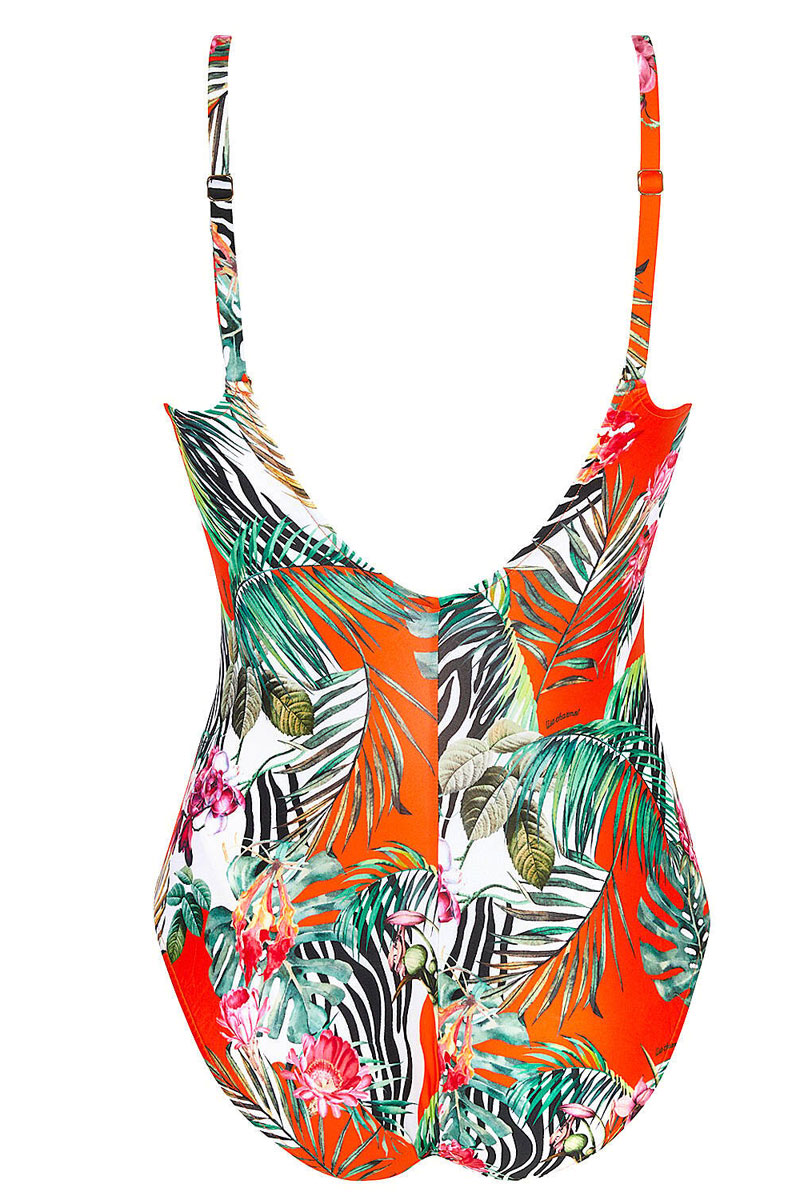 Strój kąpielowy jednoczęściowy z miękkimi miseczkami z fiszbinami typu underwired, one-piece swimsuit. Fiszbiny ukryte od wewnątrz stroju. Ramiączka proste, komfortowe, ozdobne, regulowane z tyłu. Strój z przodu wykończony pięknymi elementami biżuteryjnymi. Z tyłu mocno wykrojony w kształcie litery V. Strój wykonany z wysokiej jakości tkaniny z lycrą drukowanej w oryginalny, florystyczny wzór. Występuje do miseczki E.