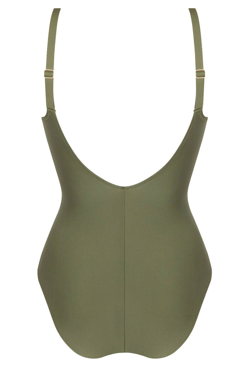 Strój kąpielowy jednoczęściowy z miękkimi miseczkami z fiszbinami o kroju typu underwired one-piece swimsuit. Dekolt półokrągły. Fiszbiny ukryte są od wewnątrz stroju. Pod biustem dodatkowa, elastyczna taśma podtrzymująca biust. Ramiączka proste, komfortowe, regulowane z tyłu. Strój wykonany z wysokiej jakości tkaniny z lycrą. Z przodu od wewnątrz strój jest podszyty dodatkową warstwą materiału dla efektu wyszczuplenia i wymodelowania sylwetki. Strój występuje do miseczki E.